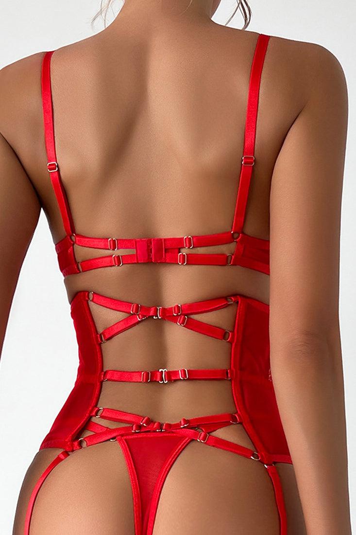 Red Flower Sheer Lace Bra Lace-Up Garter Belt Thong 3Pc Lingerie Set