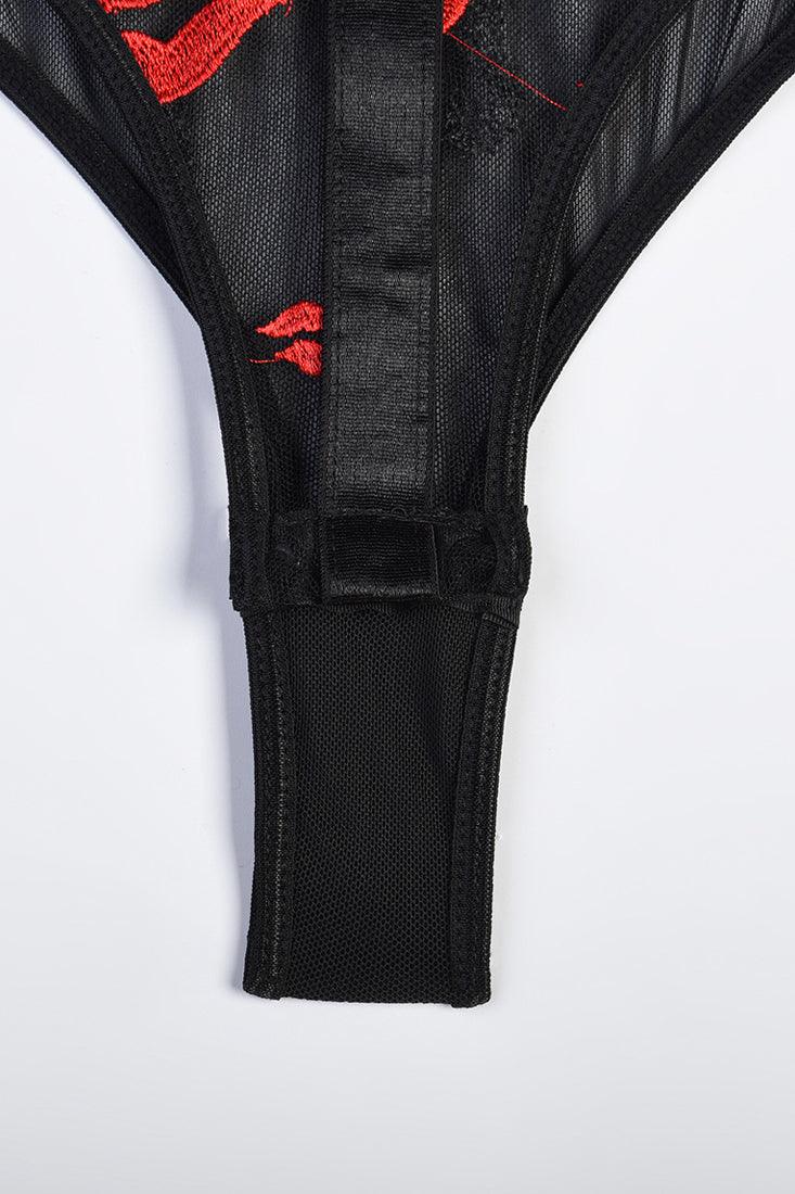 Black Lip Emboider Lace Strappy Thong Sexy Lingerie Bodysuit
