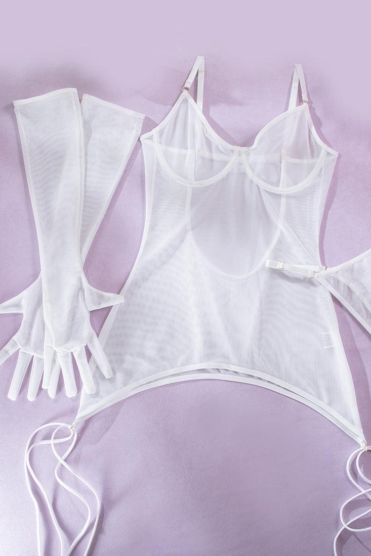 White Mesh Sheer Gloved Bodysuit Garter Thong Leg Wrap Sexy 4Pc Lingerie Set