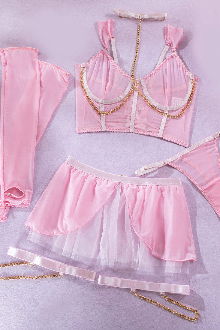Pink Gold Chain Mesh Garters Thong Gloves Sexy 7Pc Lingerie Set