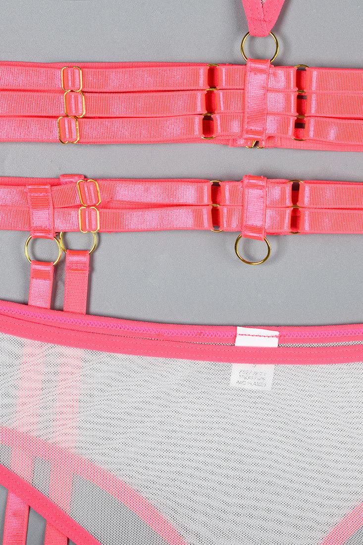 White Pink Mesh Strappy Long Sleeve Thong Garter Best 5Pc Lingerie Set