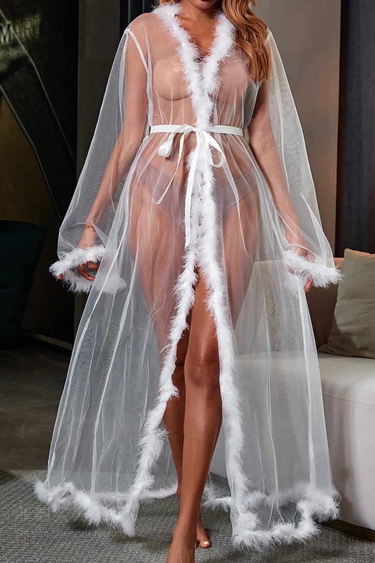 White Long Sleeve Mesh Faux Fur Trim Long Maxi Robe Lingerie