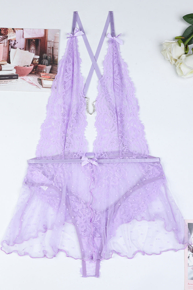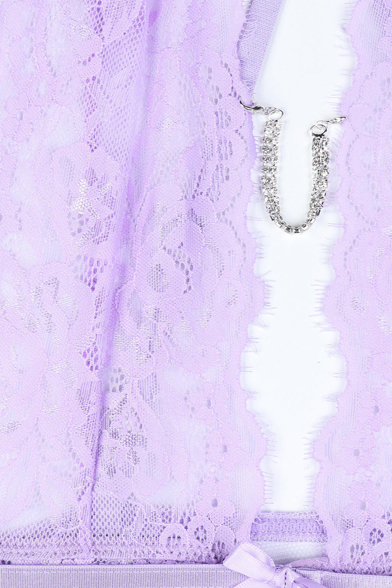 Lavender Lace Mesh Bow Rhinestone Plunging Skirted Thong Bodysuit Lingerie