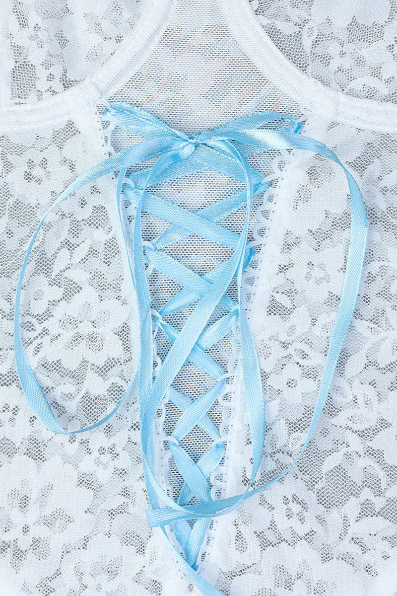 White Blue Lace Mesh Wired Bra Lace-Up Ruffle Thong Garter Bodysuit Sexy Lingerie