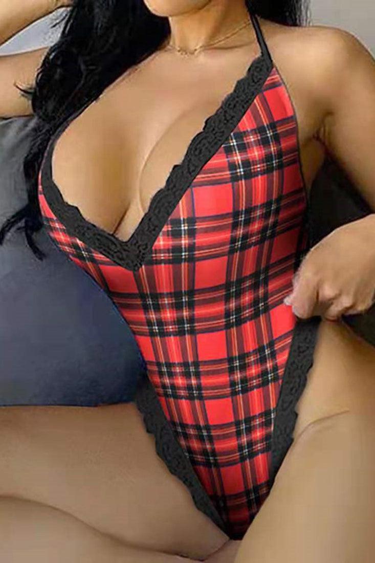Black Red Plaid Lace Bodysuit Holiday Pajamas Lingerie