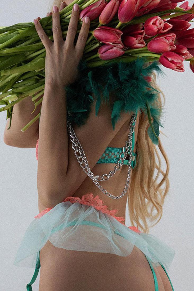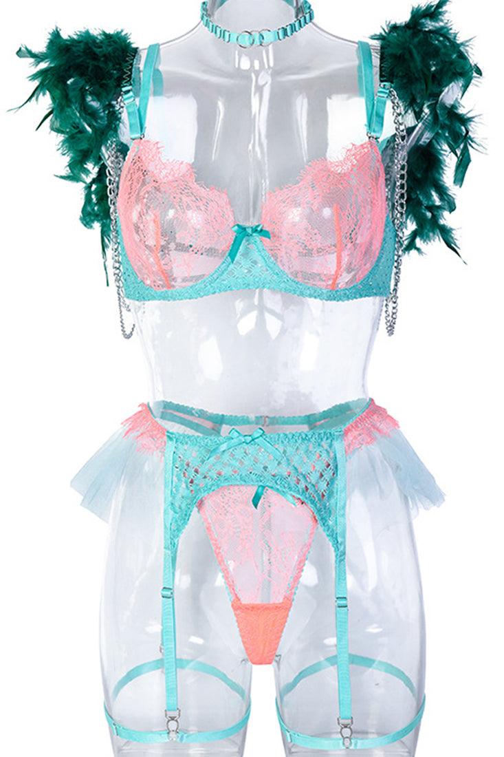 This Pink Green Lace Feather Chain Tulle Lingerie Set includes a bra, thong, garters, garter belt, choker, and more for a flirty and playful look. The delicate lace and feathers add a touch of elegance, while the chain details add a hint of edginess. Perfect for a fun and unique lingerie ensemble!