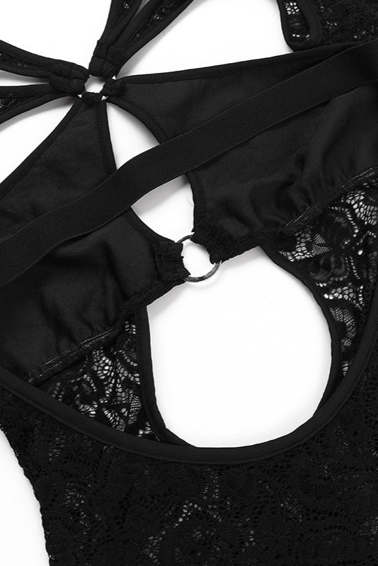 Black Lace Cut-Put O-Ring Long Sleeve Fitted Sexy Romper