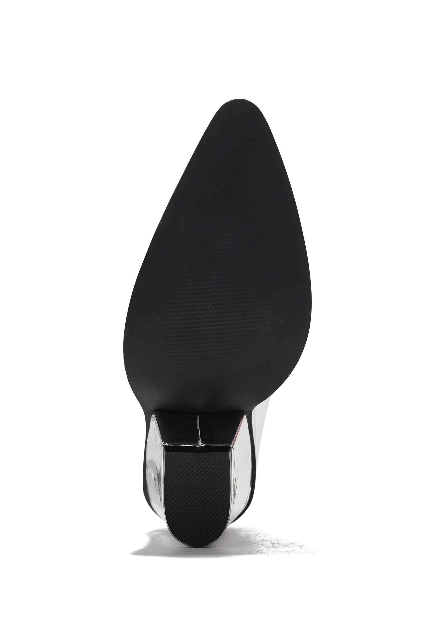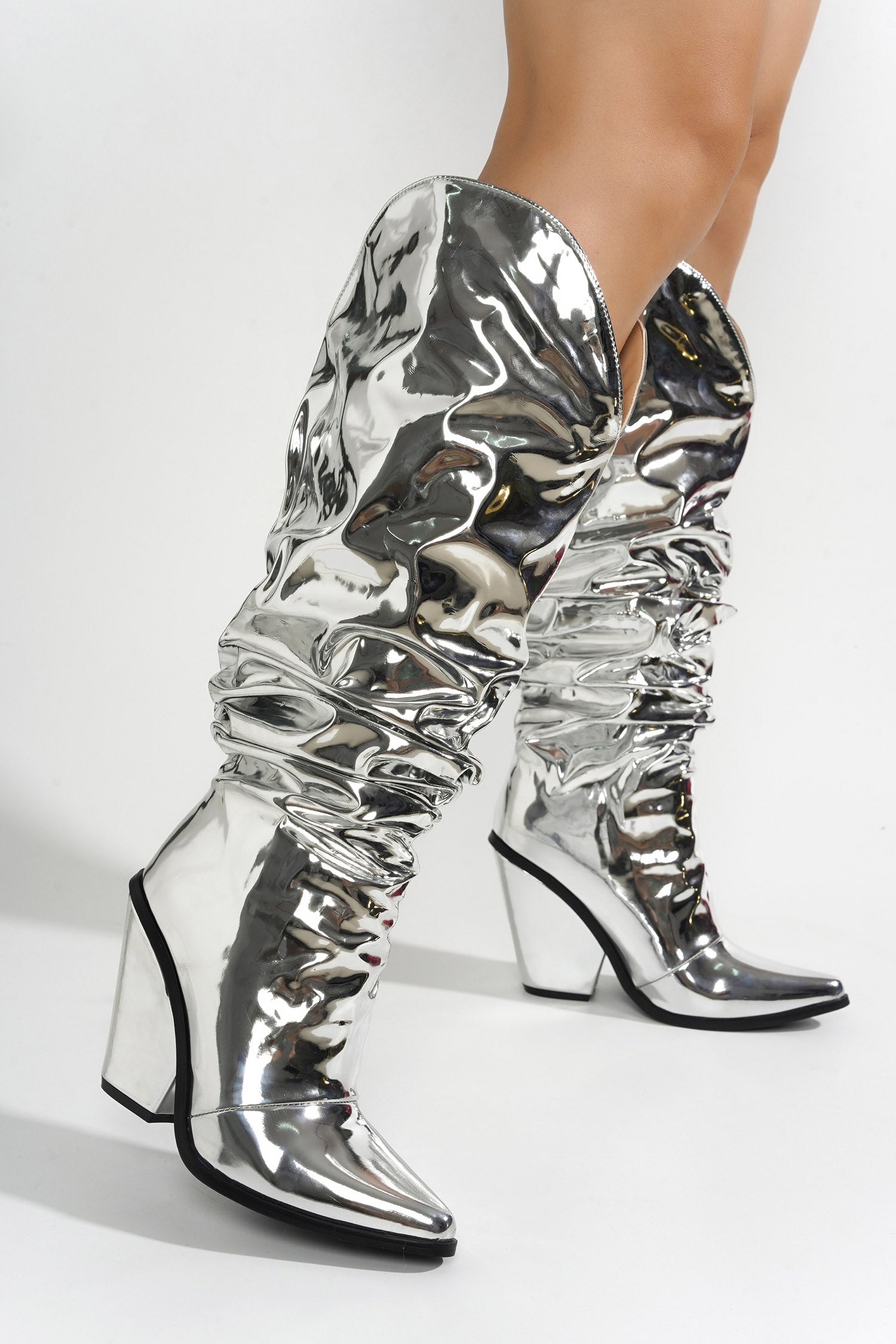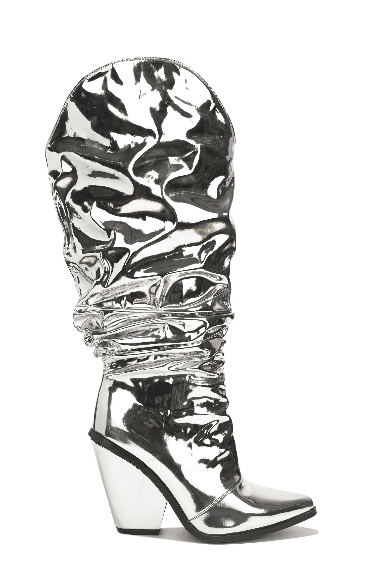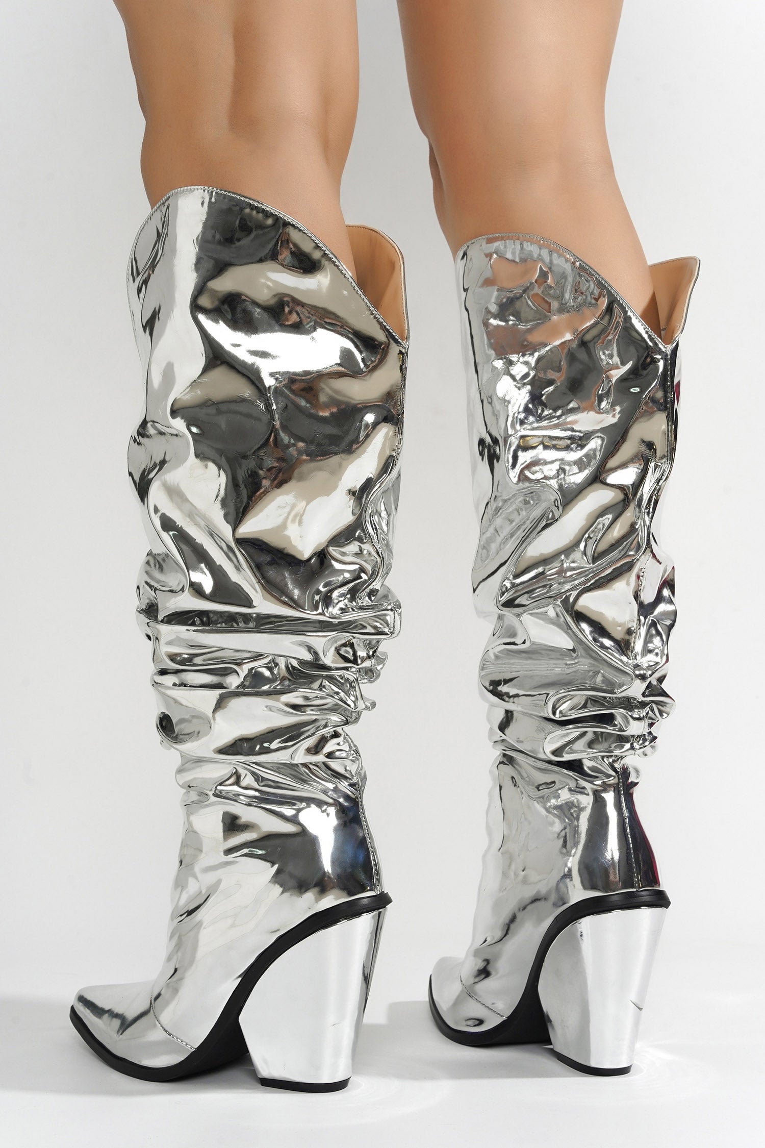 Cowboy boots with a modern twist! Hanarin is made of reflective,metallic upper and features a scrunch shaft,mid block heel,and pointy toe.