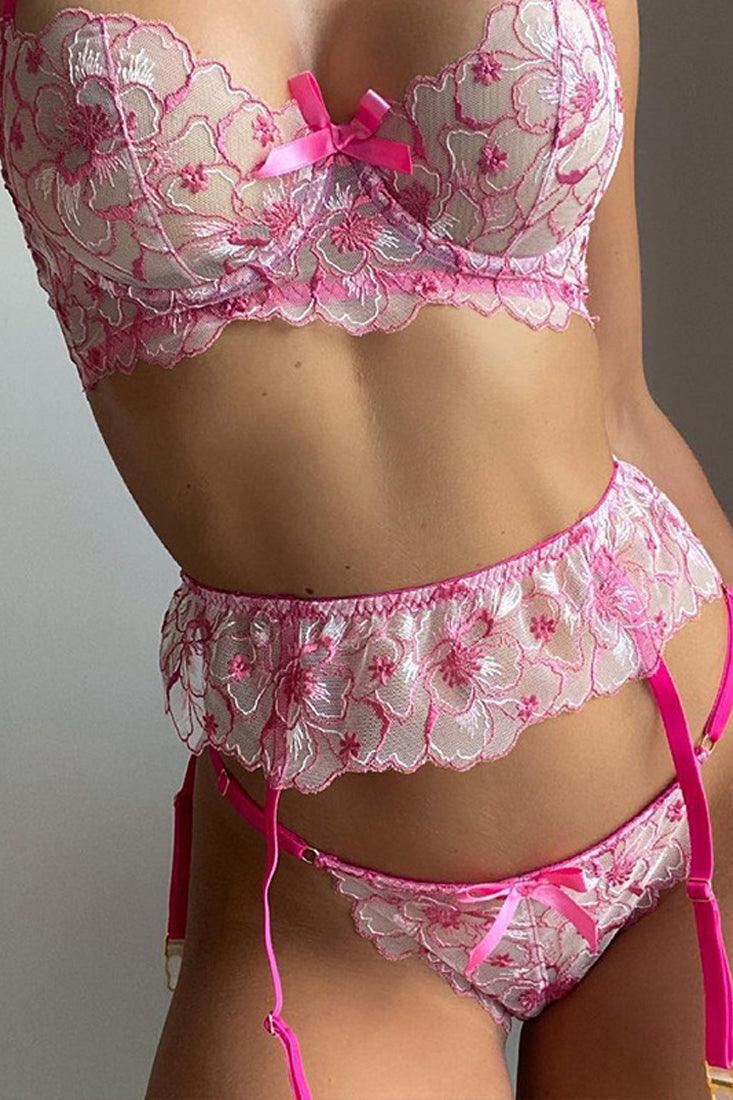 Pink Flower Embroider Mesh Bra Thong Garter Sexy 3Pc Lingerie Set