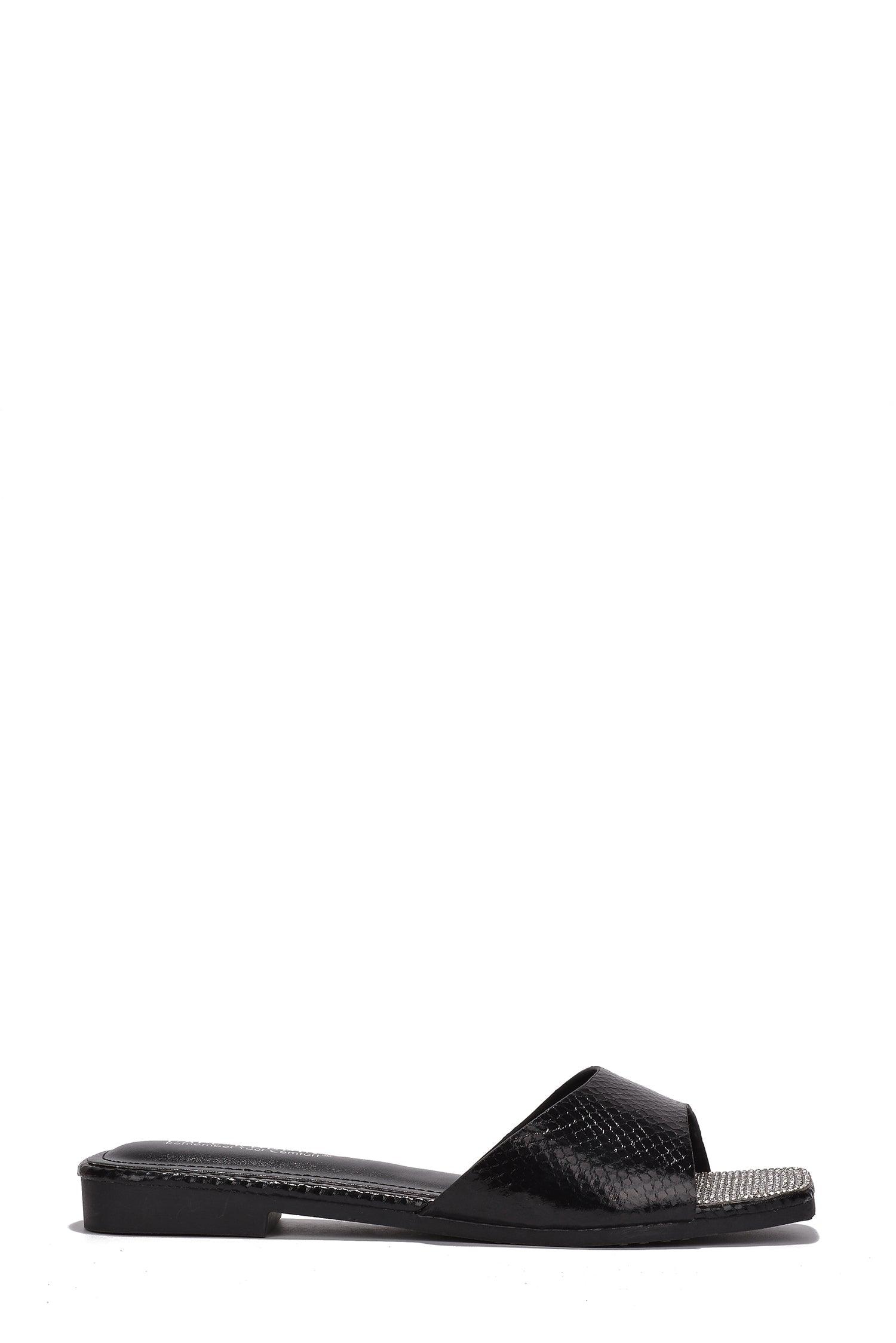 The Seya square open toe flat sandals are the perfect versatile shoes to take you from day to night in style. The sandals feature a metallic snake print finish with a rhinestone detail for a touch of sparkle. They also have a padded insole for added comfort and a secure fit. These sandals will become your go-to shoes for any occasion.