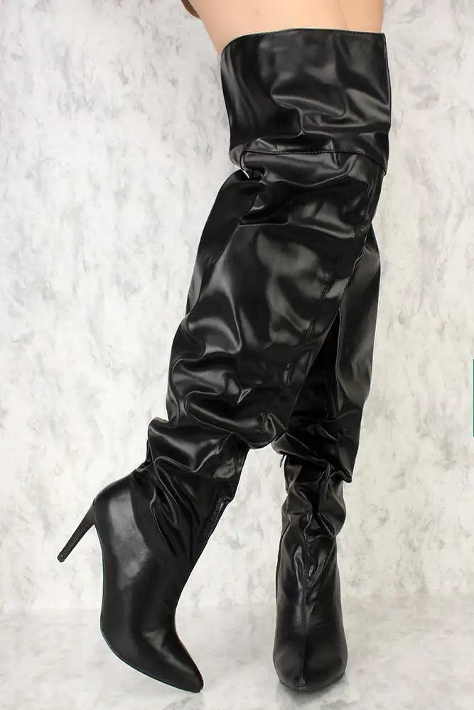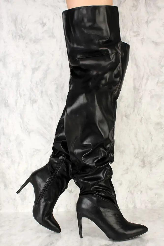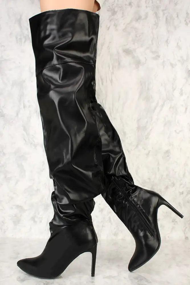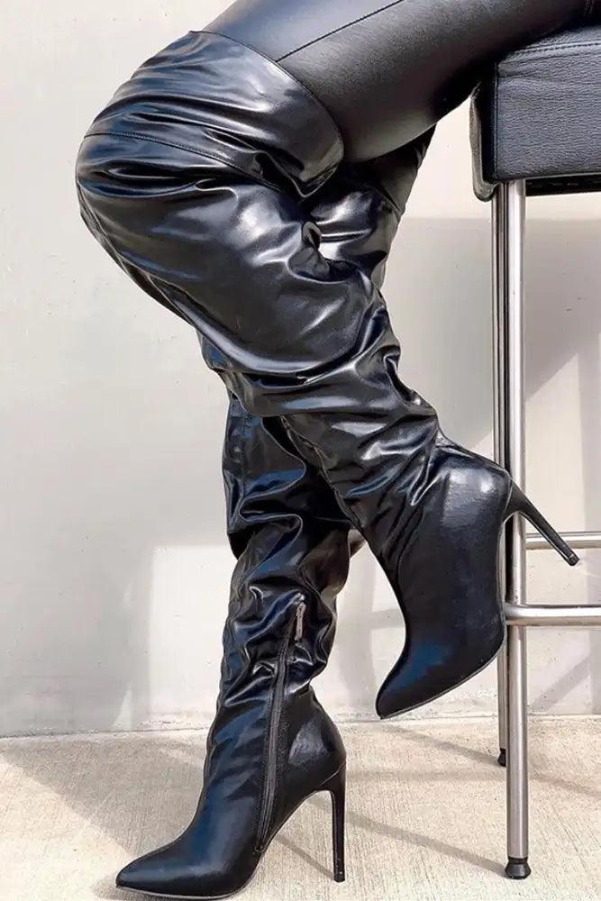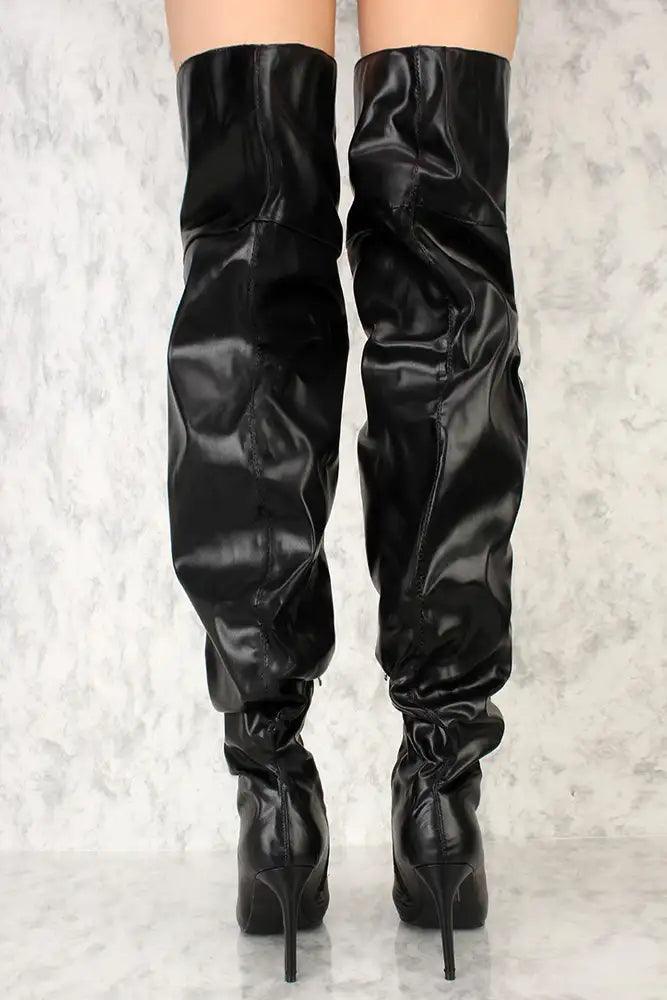 Black Ruched Pointy Toe Thigh High Boots Faux Leather