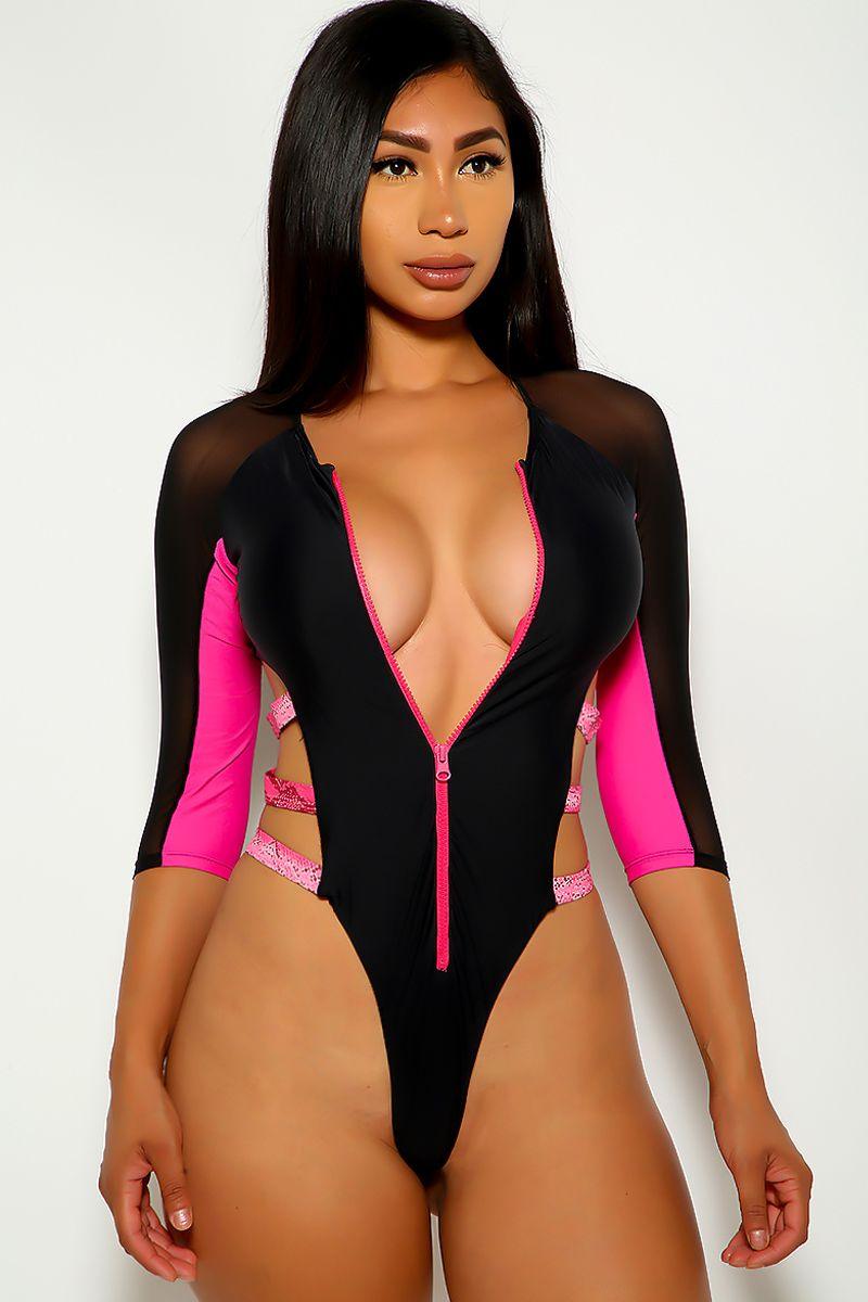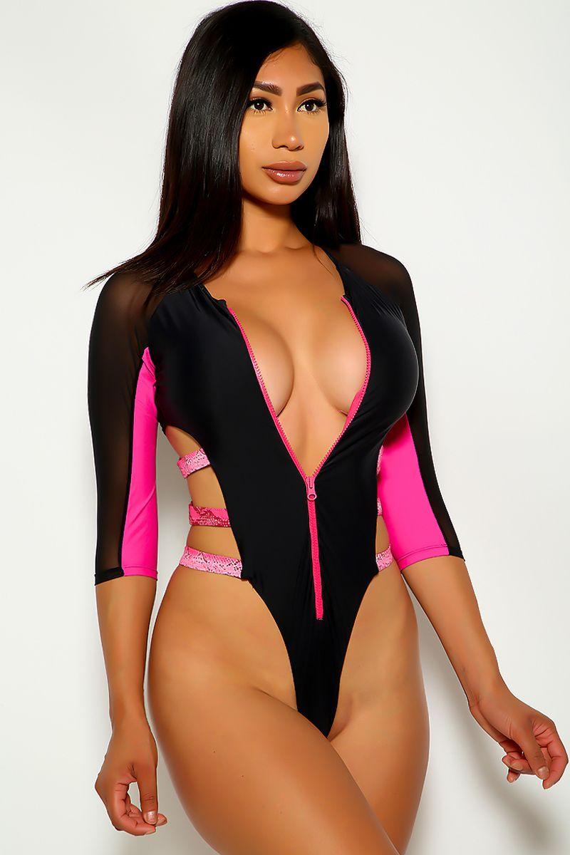 Slay in style with this fabulous monokini! Featuring; mid sleeves, front zipper, mesh, sheer, two-tone, strappy detail. 90% Polyester, 10% Spandex.