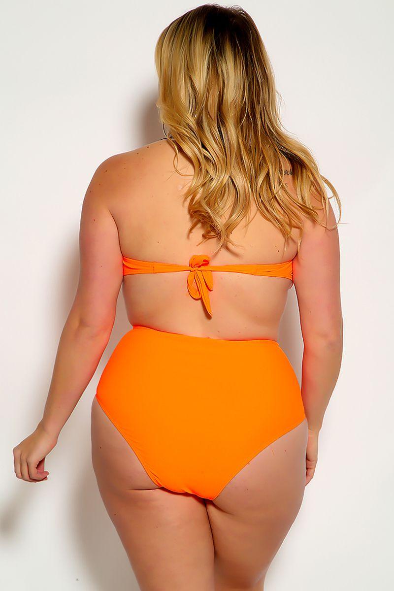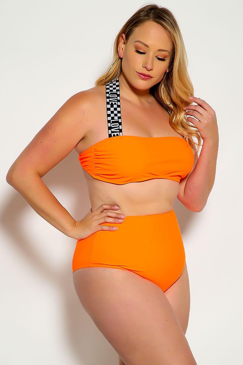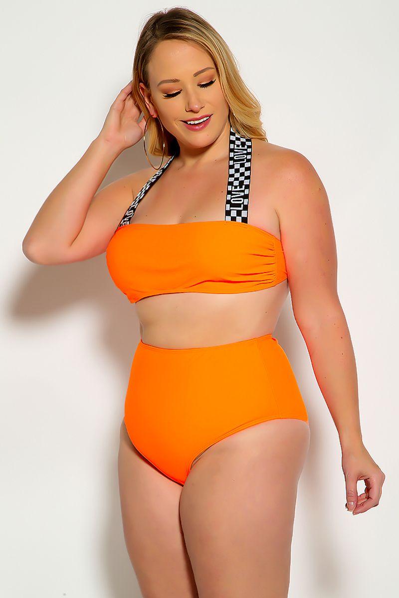 White Neon Orange Love Print Halter Bandeau High Waist Plus Size Swimsuit