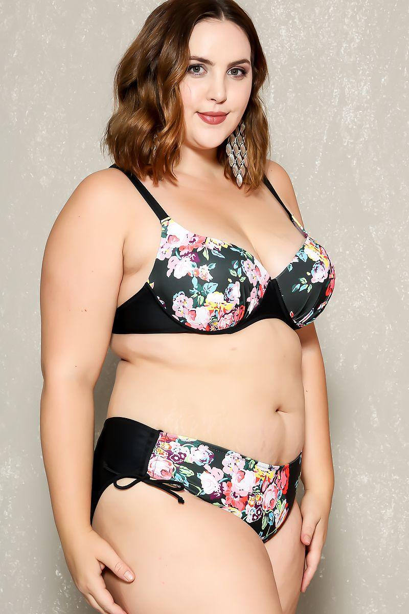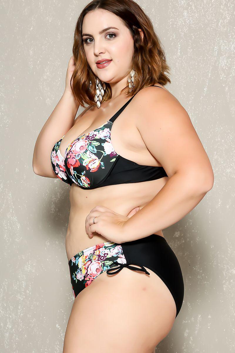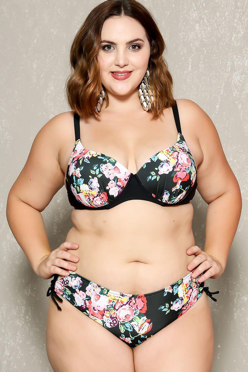 Sexy Black Floral Print Push Up 2Pc. Plus Size Swimsuit