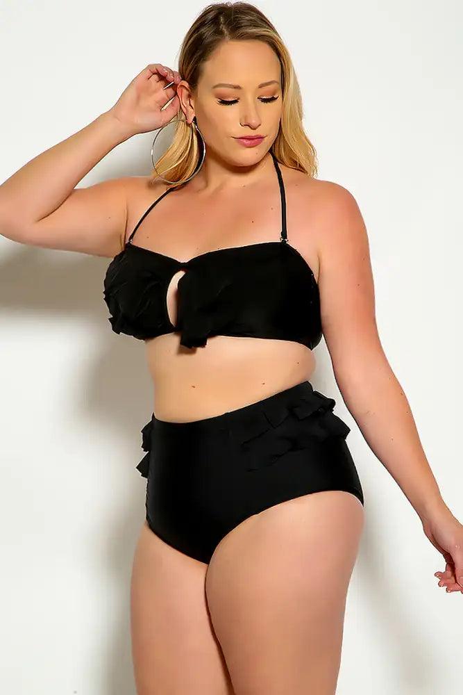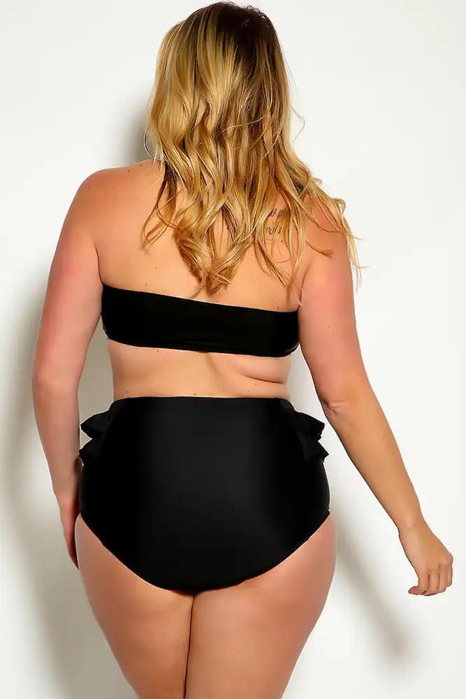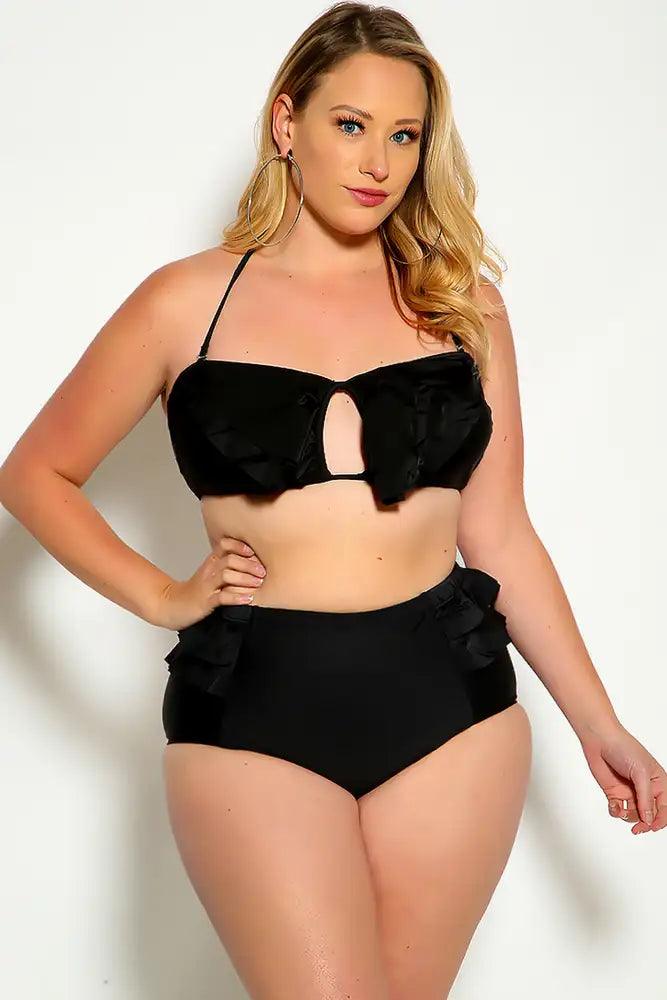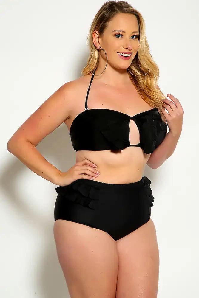 Sexy Black Ruffle Accent Padded High Waist Two Piece Plus Size Bikini