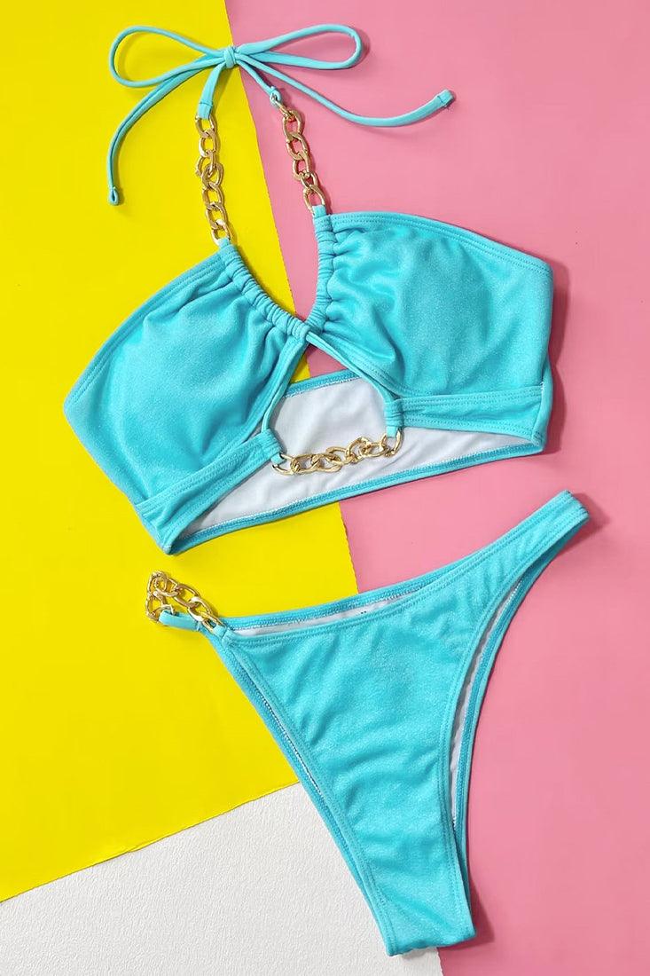 Sky Blue Gold Chain Shimmer Sparkly Cheeky 2Pc Swimsuit Set Bikini
