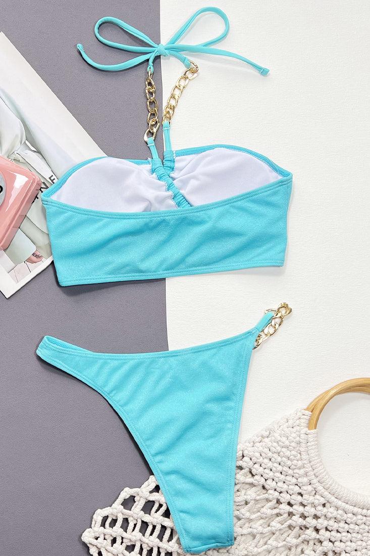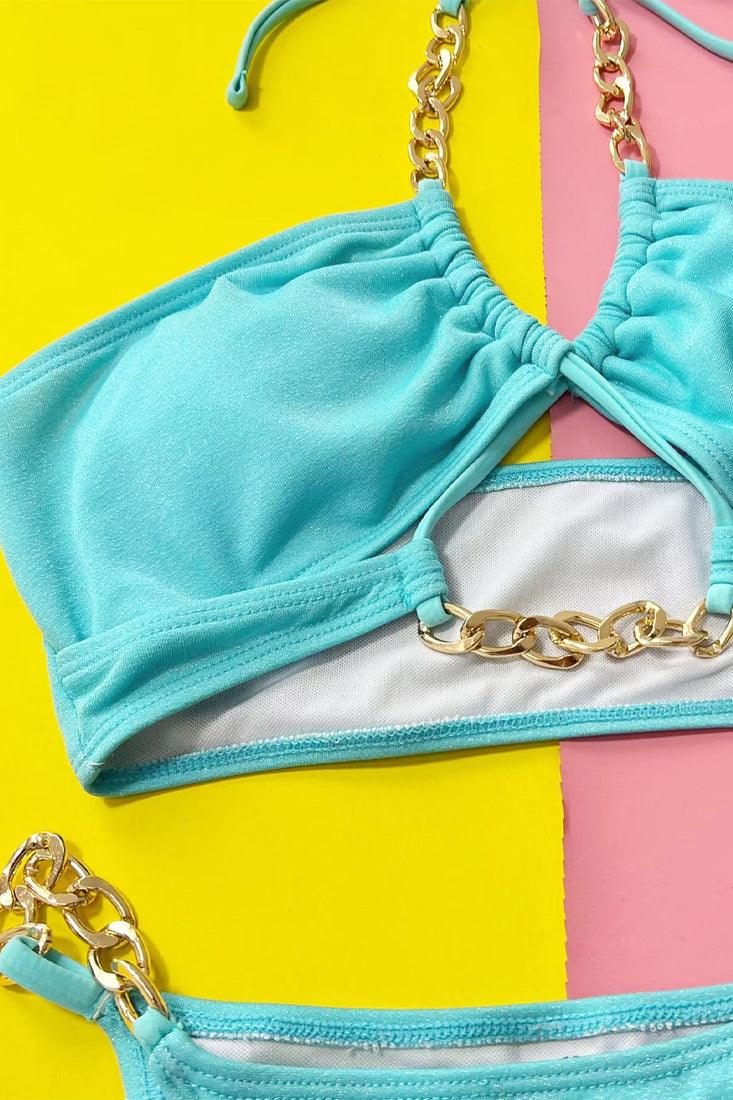 Get ready to sparkle and shine at the beach or pool with our Sky Blue Gold Chain Shimmer Sparkly Bikini Set! This 2-piece swimsuit features a cheeky design and a stunning gold chain detail, adding a touch of glamour to your swimwear. Stand out with this unique and playful swimsuit!