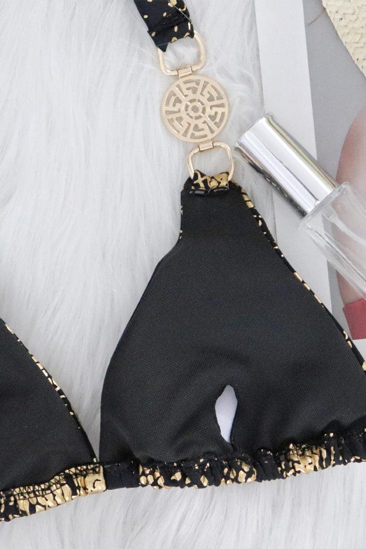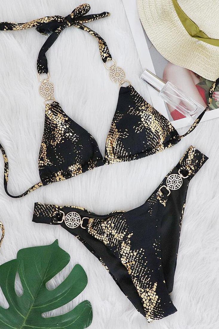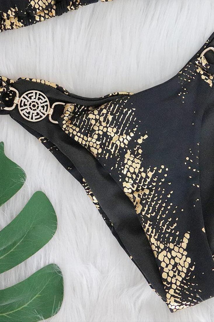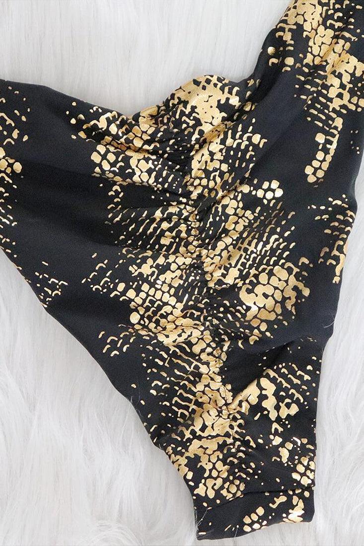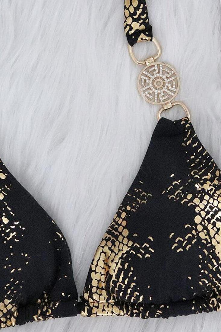 Black Gold Foil Snake Print Rhinestone Triangle Cheeky Ruched Butt 2Pc Swimsuit Set Bikini