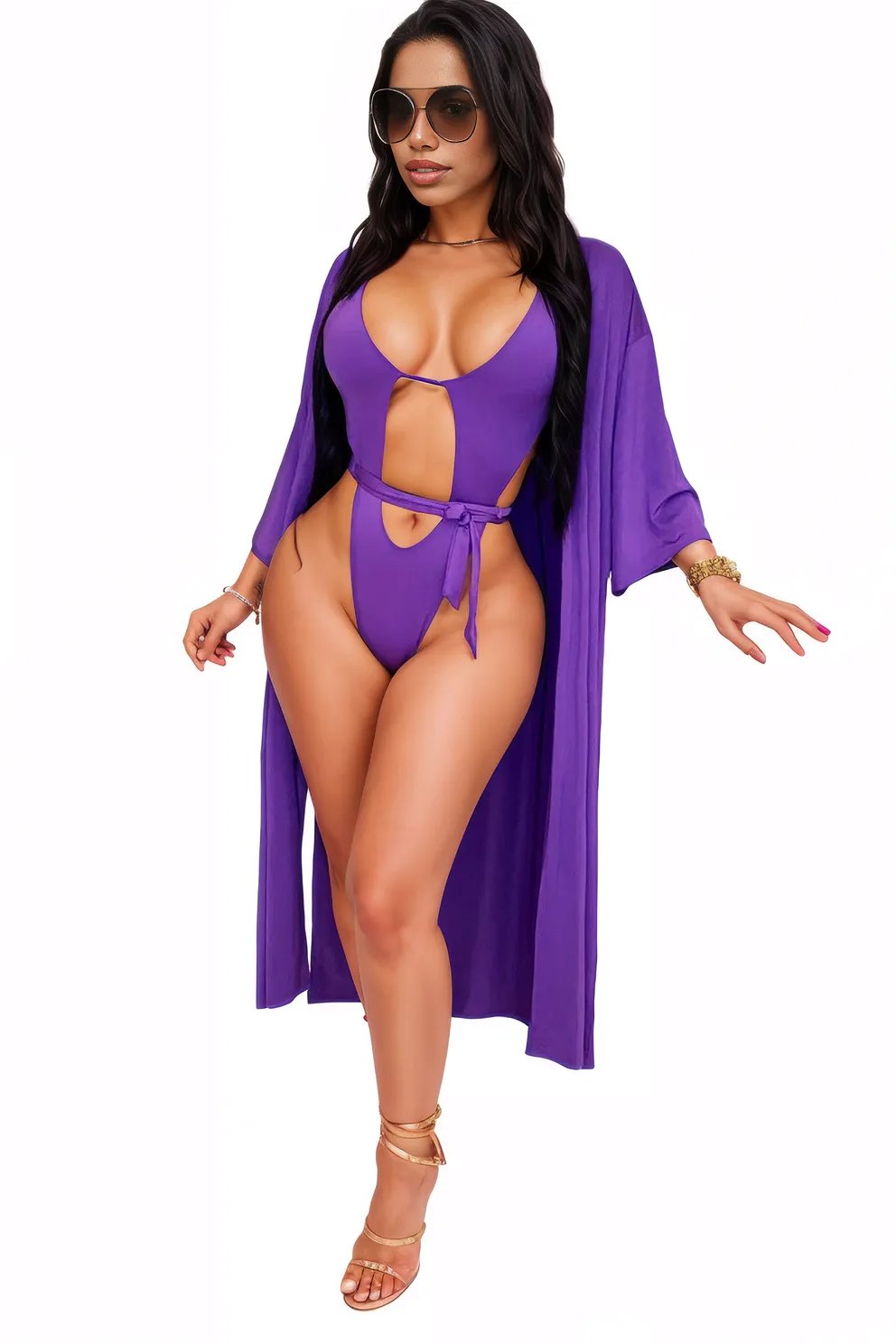 Unleash your inner fashionista with our Purple Strappy Monokini Kimono Cover-Up 2Pc Swimsuit Set. The perfect combination of style and functionality, this swimsuit set features a chic and strappy monokini paired with a trendy kimono cover-up. Look effortlessly cool and stay on-trend at the beach or pool.