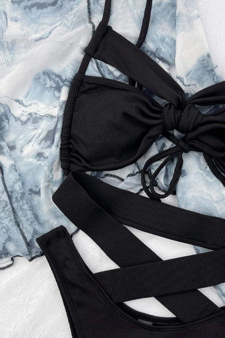 Black Ribbed Thick Strappy Cut-Out High-Waist Cheeky Sexy 2Pc Swimsuit Set