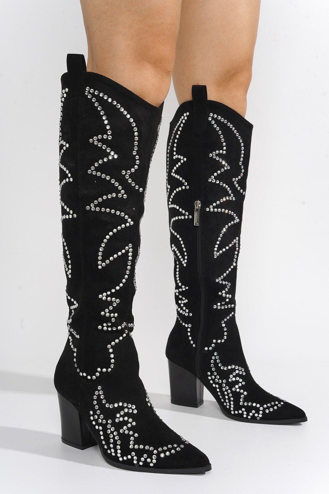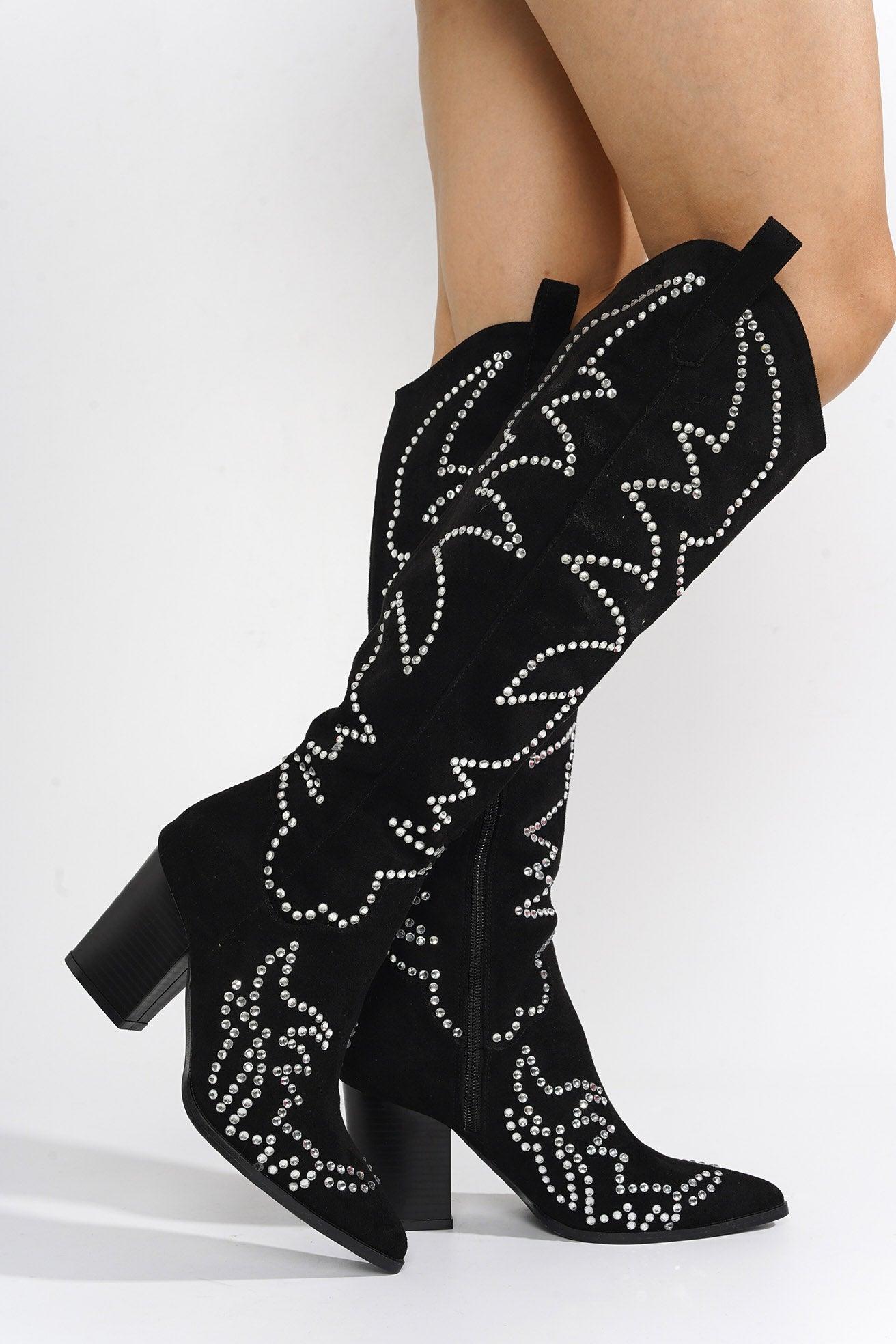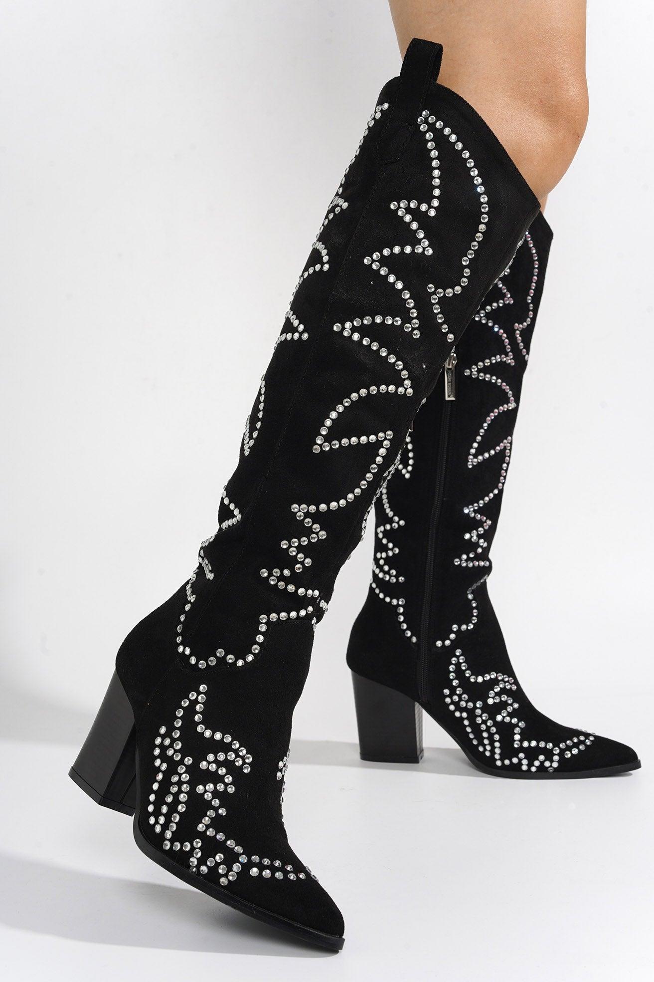 Wild,wild West with a modern twist! Tripoli cowgirl boots reel in attention with their knee-high silhouette,premium suede material,and shiny rhinestones.