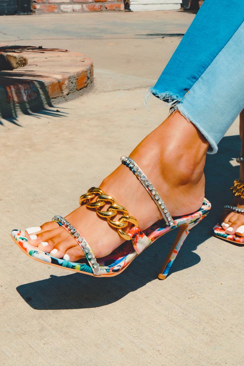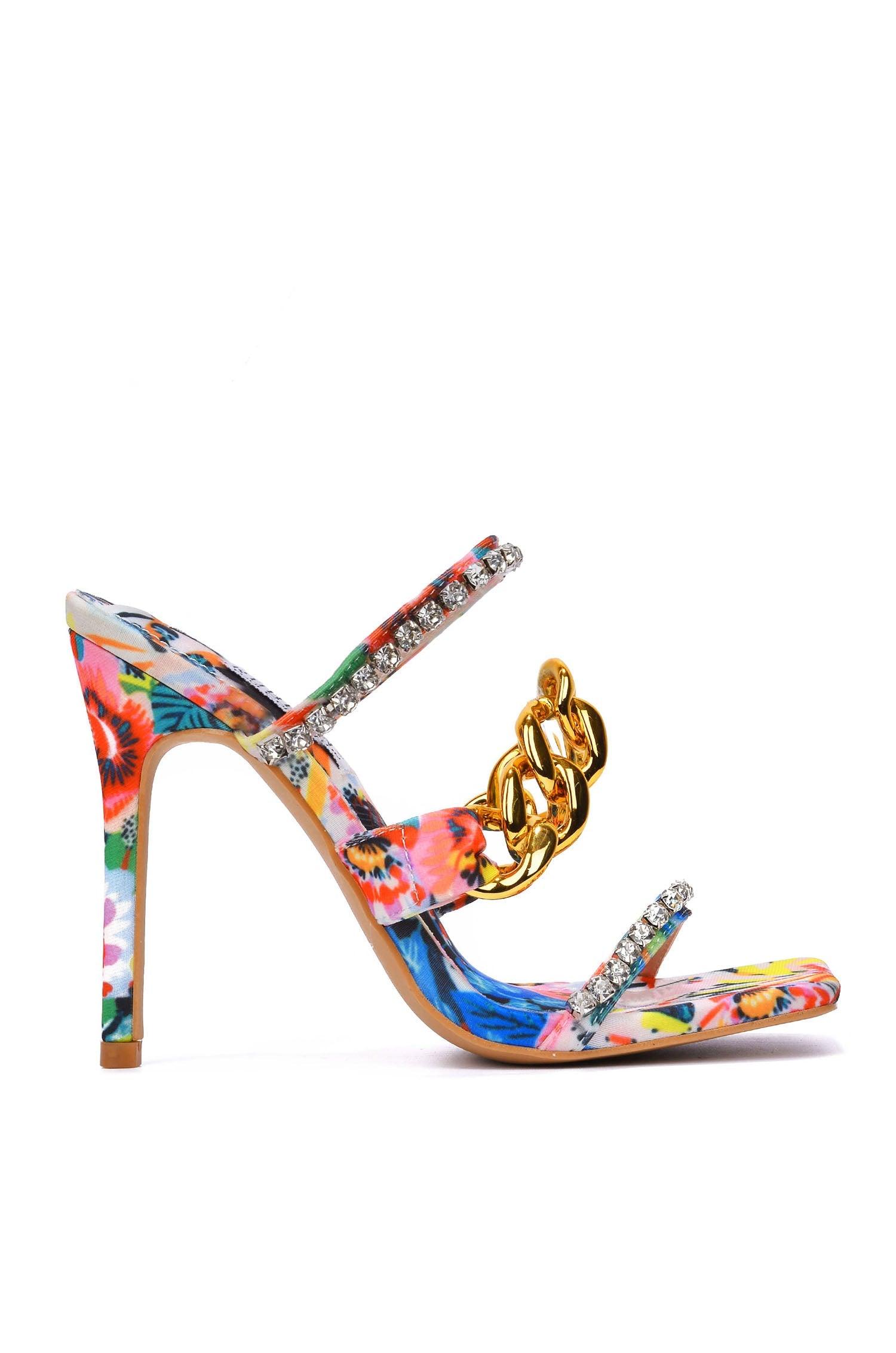 These Vavaboom high heels are sure to make a statement wherever you go. With a classic and sophisticated silhouette,the upper is adorned with gorgeous rhinestone trim and a modern and glamorous chain detail. Available in print,brown,and pink.