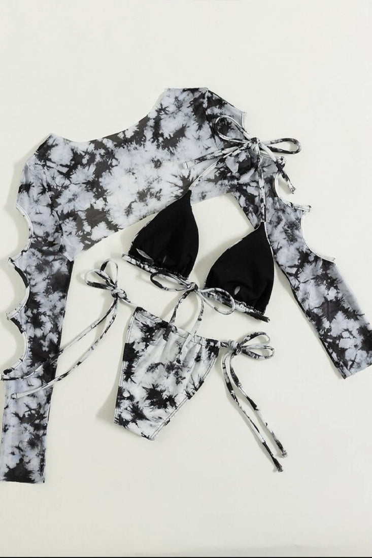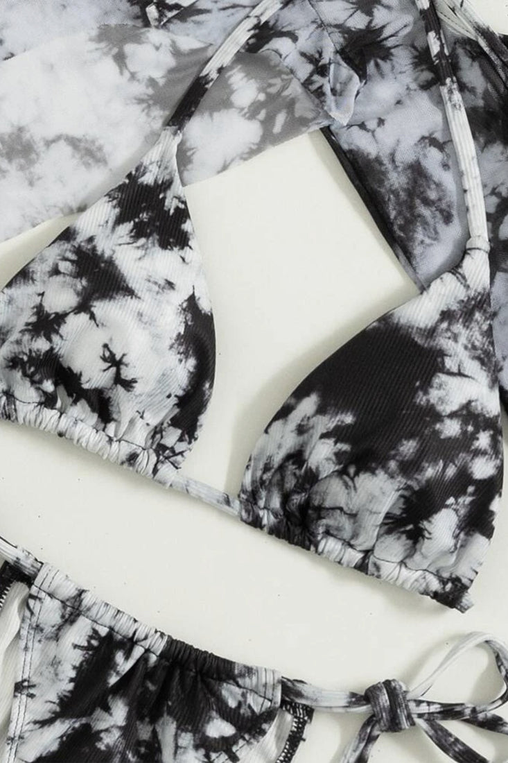 White Black Tie Dye Ribbed Bikini Mesh Cover-Up 3Pc Swimsuit Set
